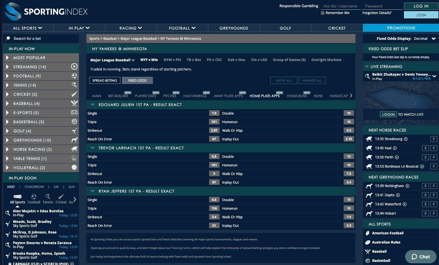 This has recently improved, and by quite a bit. Previously there was a real lack of markets, but Sporting Index has rectified this, and now the baseball offering is significantly better. Bettors will notice that a lot of the sections on the baseball menu are labelled “New” as a result. This includes Player Stats, Pitches, Half-Innings, Plate Apps and more. See if it makes it into our top baseball betting sites in the country.