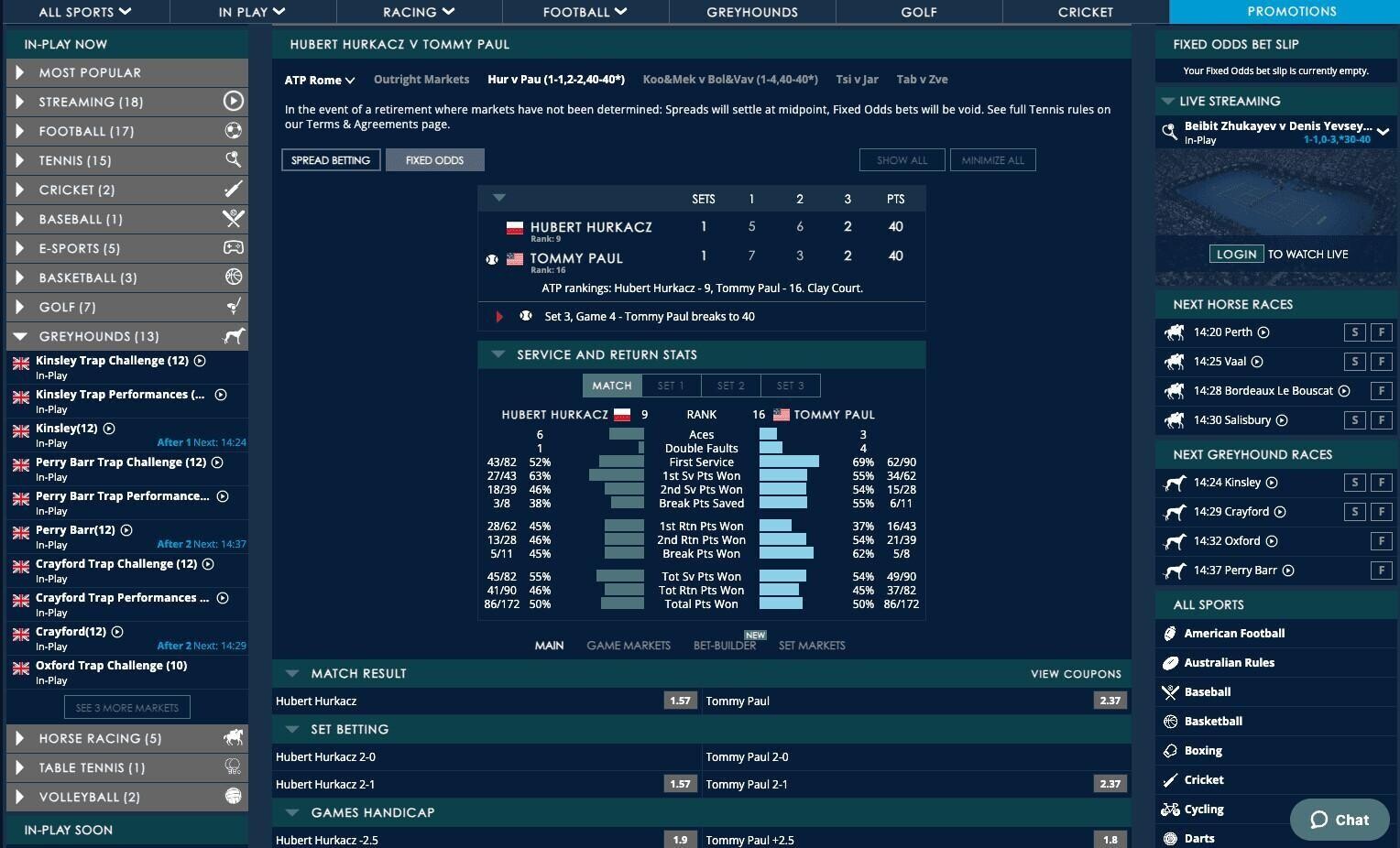 There are a lot of very good things going on here. All the sports that are currently live and have in-play markets are displayed clearly. During the time of this review that included tennis, football, golf, baseball, esports and plenty more. These in-play markets are fantastic, with plenty of betting options within each event. The in-game stats are also fantastic, across most sports and you can see why we rank them in our best bookmakers for in-play betting.