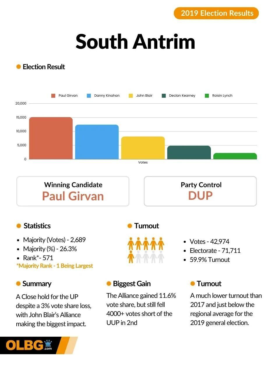 Voter turnout for the South Antrim seat was at 59.9%. This figure was down 1.9% on the region as a whole and down 3.4% when compared to the same seat in 2017. From a UK-wide perspective it was down 7.4% when compared to the average turnout for 2017.