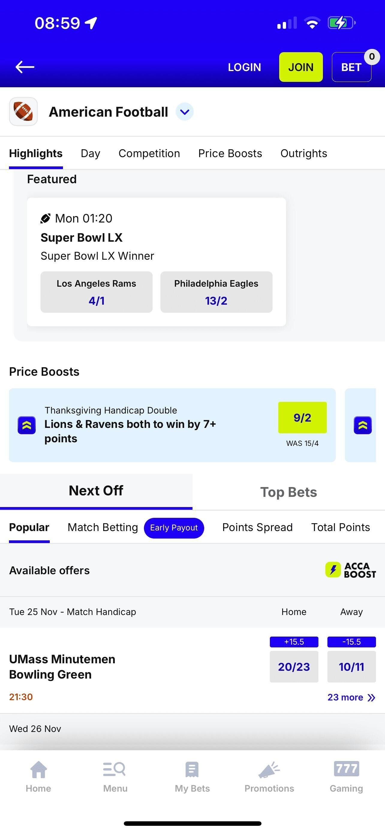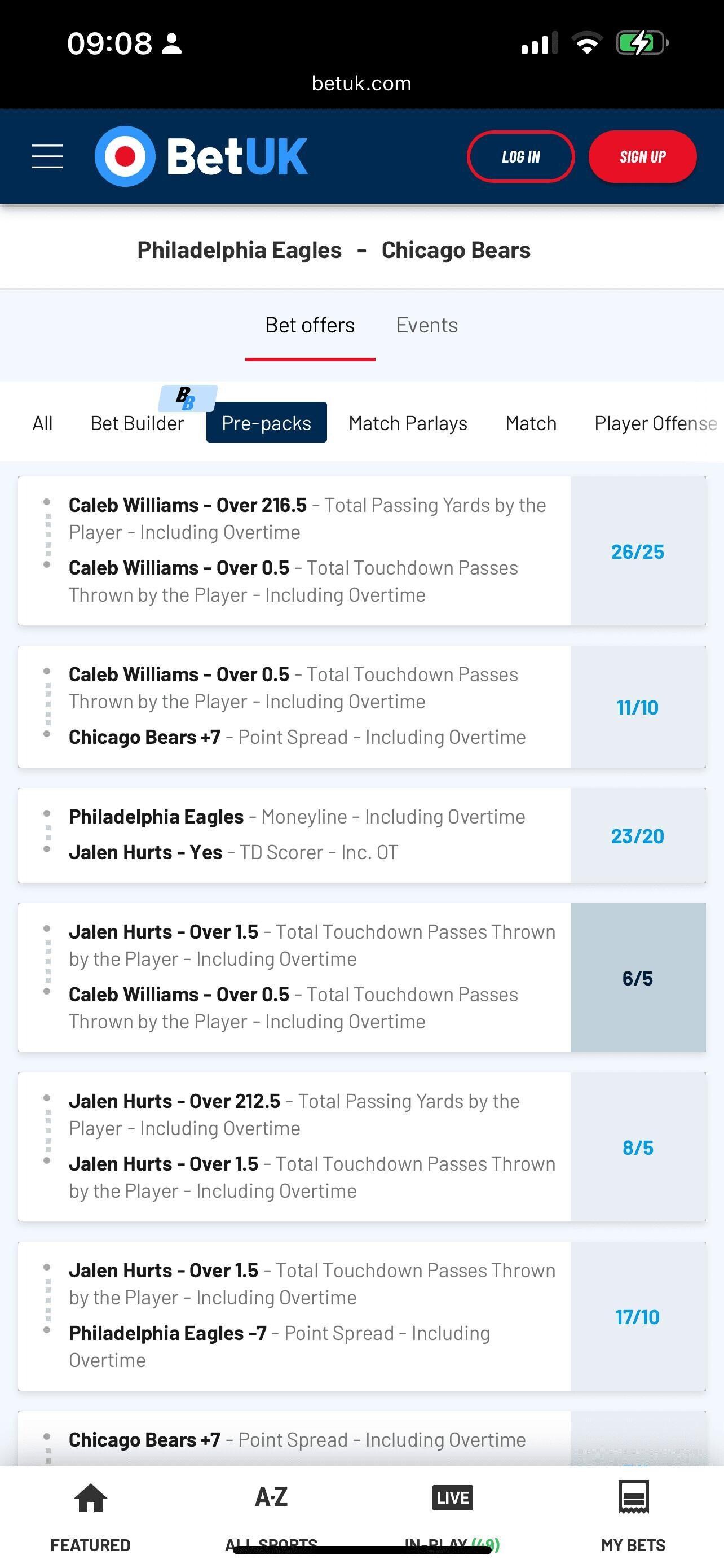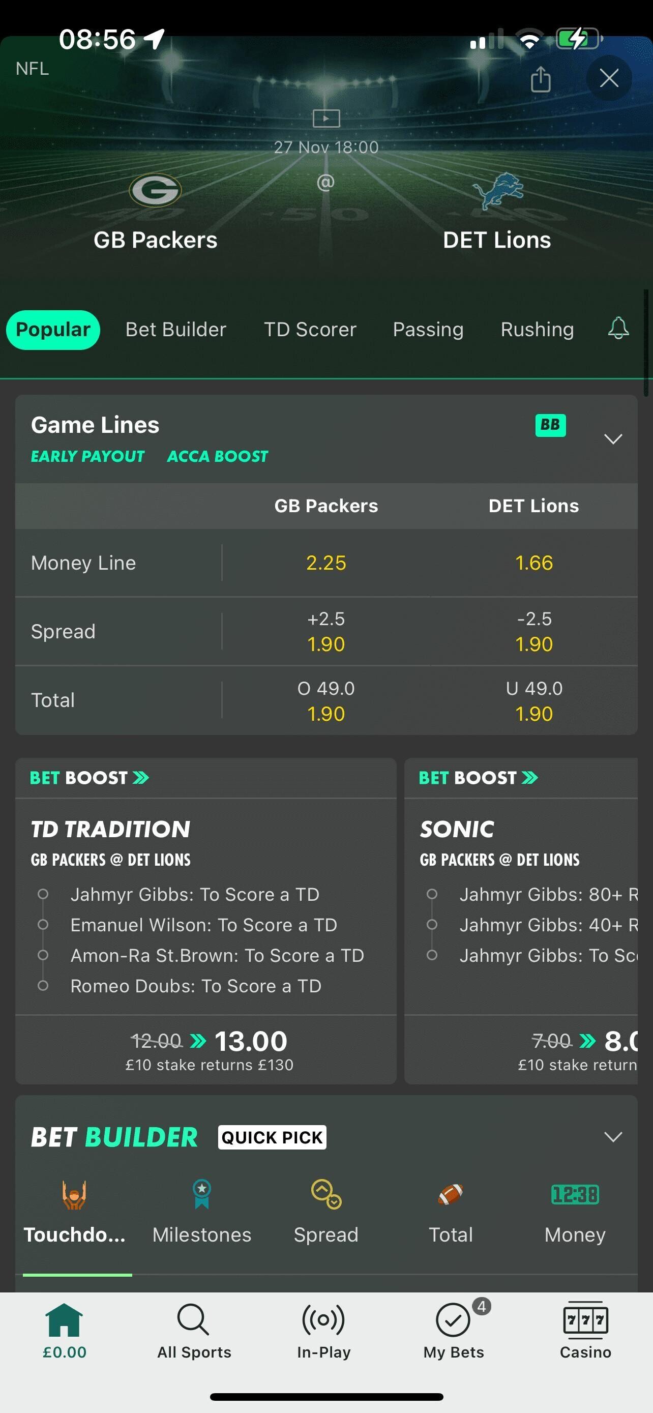 Price boosts, after price boosts, after price boosts. You can’t move for odds on the NFL and NCAA being boosted at BoyleSports. That applies to prop bets, futures, outrights and game lines. You can’t put together your own bet builders, but four and five-leg accas have, unsurprisingly, been boosted. It more than makes up for not having great odds to start off with, plus they also have acca insurance and brilliant cash out options. They’re brilliant.