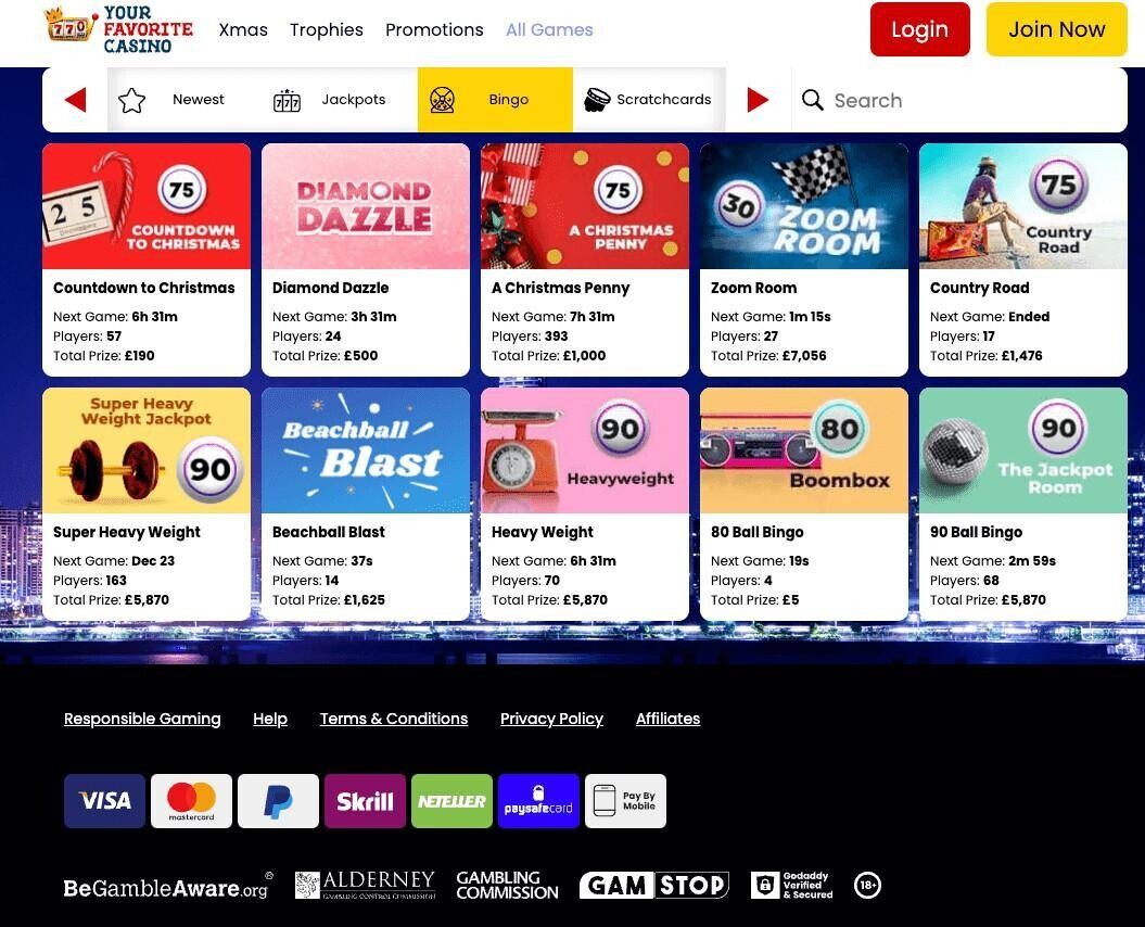 Your Favorite Casino has 10 different bingo rooms that players can join at different times to enjoy. These are supplied by different developers and each displays when the game starts, numbers of players and total prize money. Games include Diamond Dazzle, 80 Ball Bingo, Country Road and Zoom Room. Most of these total prizes are between £1,000 and £7,000.