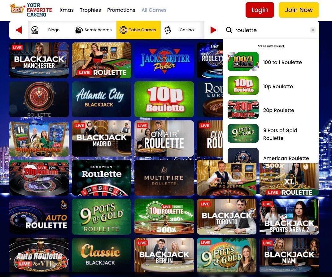 Your Favorite Casino has a really good selection of live dealer games. Among them live versions of roulette, blackjack, game shows, poker and baccarat. Found within the Table Games part of the site, all table games are grouped together and I can see a pretty good selection of each, including Roulette Azure, Blackjack Sports Arena 2, Multibet Baccarat and Airwave Roulette.