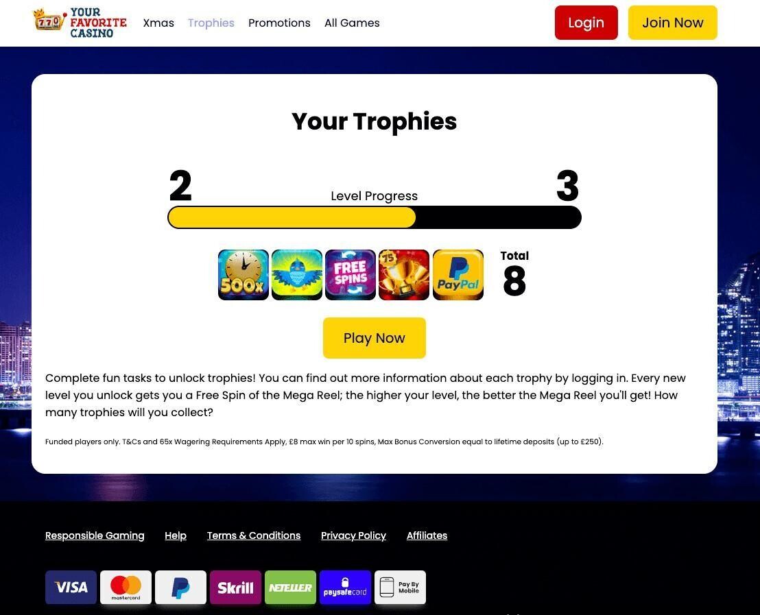 Just at the time of this review (I’m aware this may change depending on time of year) there is a Air Fryer Giveaway, a £2k Slingo Bonus Giveaway, a few different ways to win free spins and cash drops and trophy rewards.