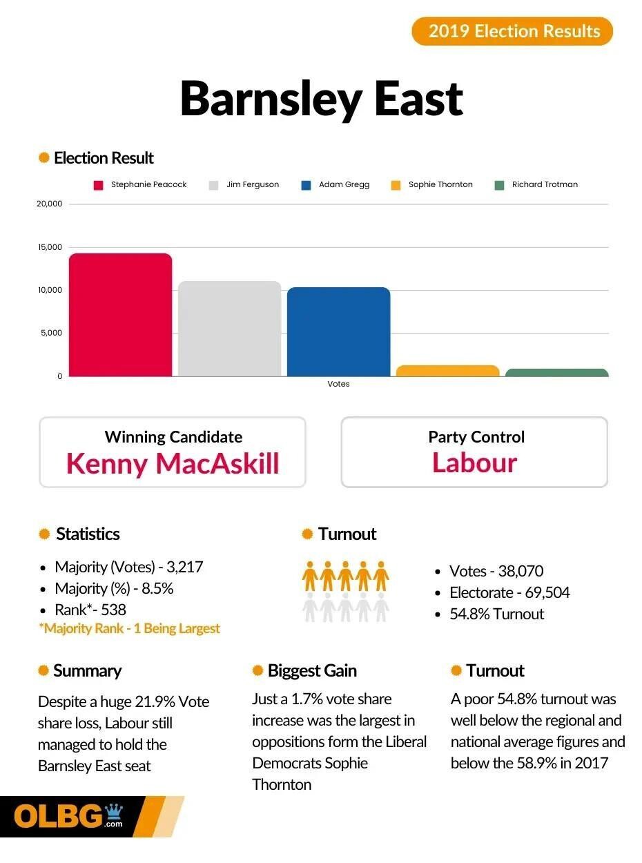 With a votes majority of 3,217 from the 38,070 cast, the majority in percentage terms was 8.5%, making Barnsley East the 538th safest seat in the 2019 General Election.