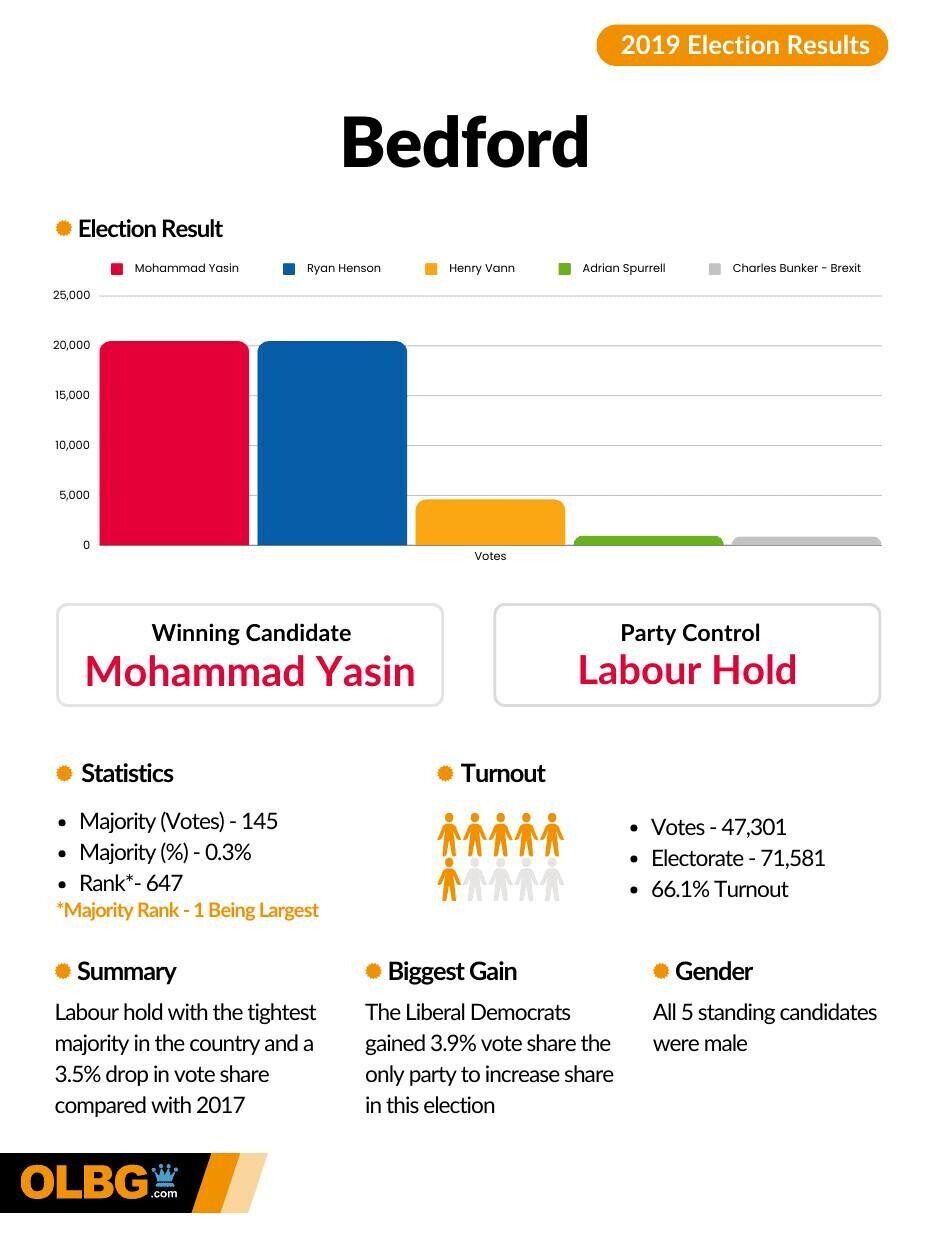 With a votes majority of just 145 from the 47,301 cast, the majority in percentage terms was a tiny 0.30%, making Bedford the fourth closest run constituency in the 2019 general election.