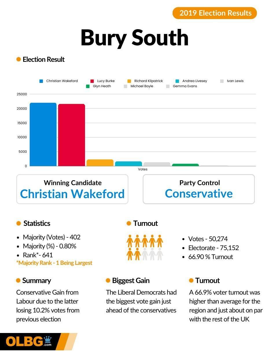 Voter turnout for the Bury South seat was at 66.9%. This figure was up 1.3% on the region as a whole and down 2.3% when compared to the same seat in 2017. From a UK-wide perspective it was down 0.4% on the average turnout for 2019.