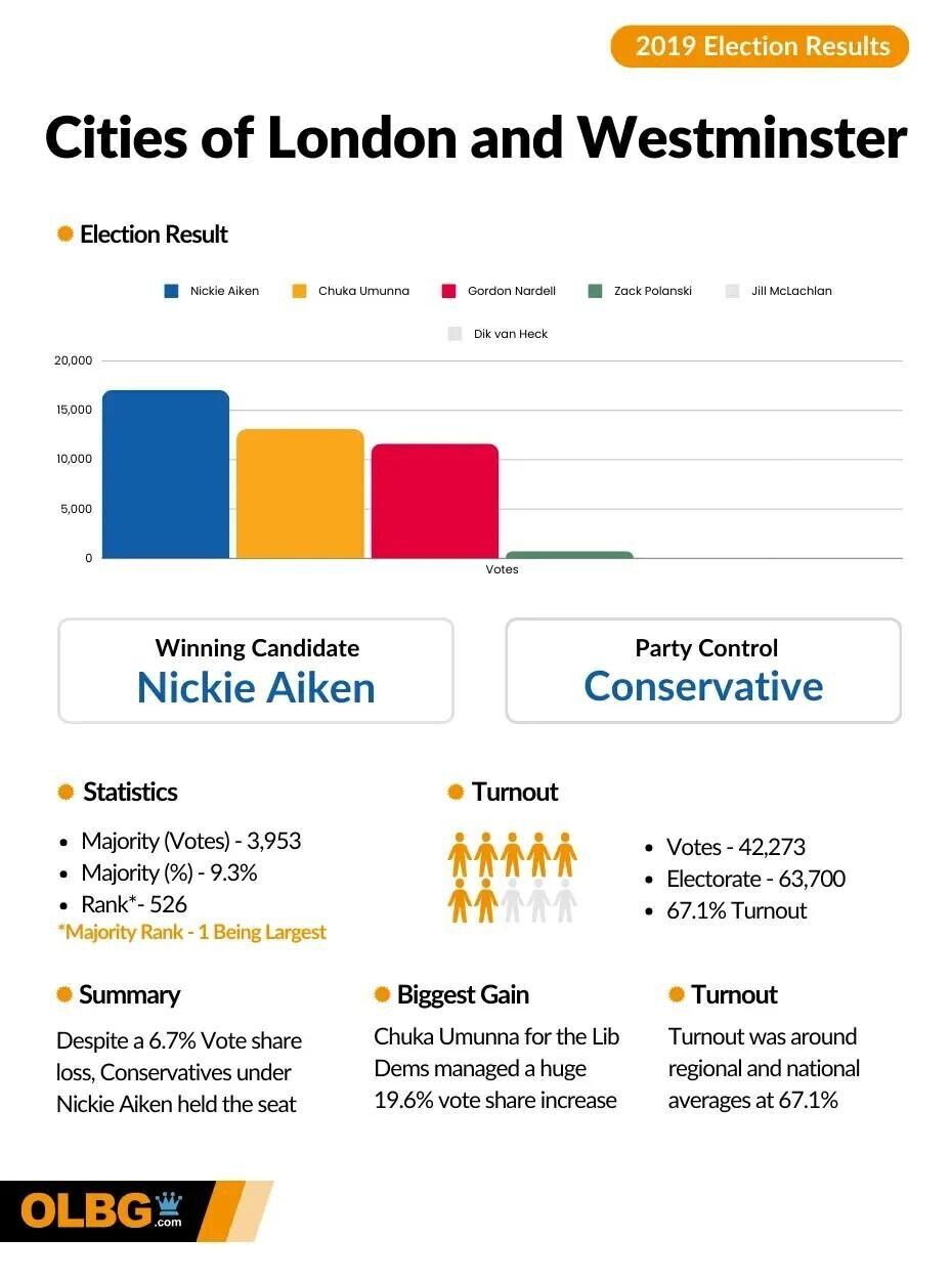 With a votes majority of 3,953 from the 42,723 cast, the majority in percentage terms was 9.3%, making Cities of London and Westminster the 526th safest seat in the 2019 General Election.