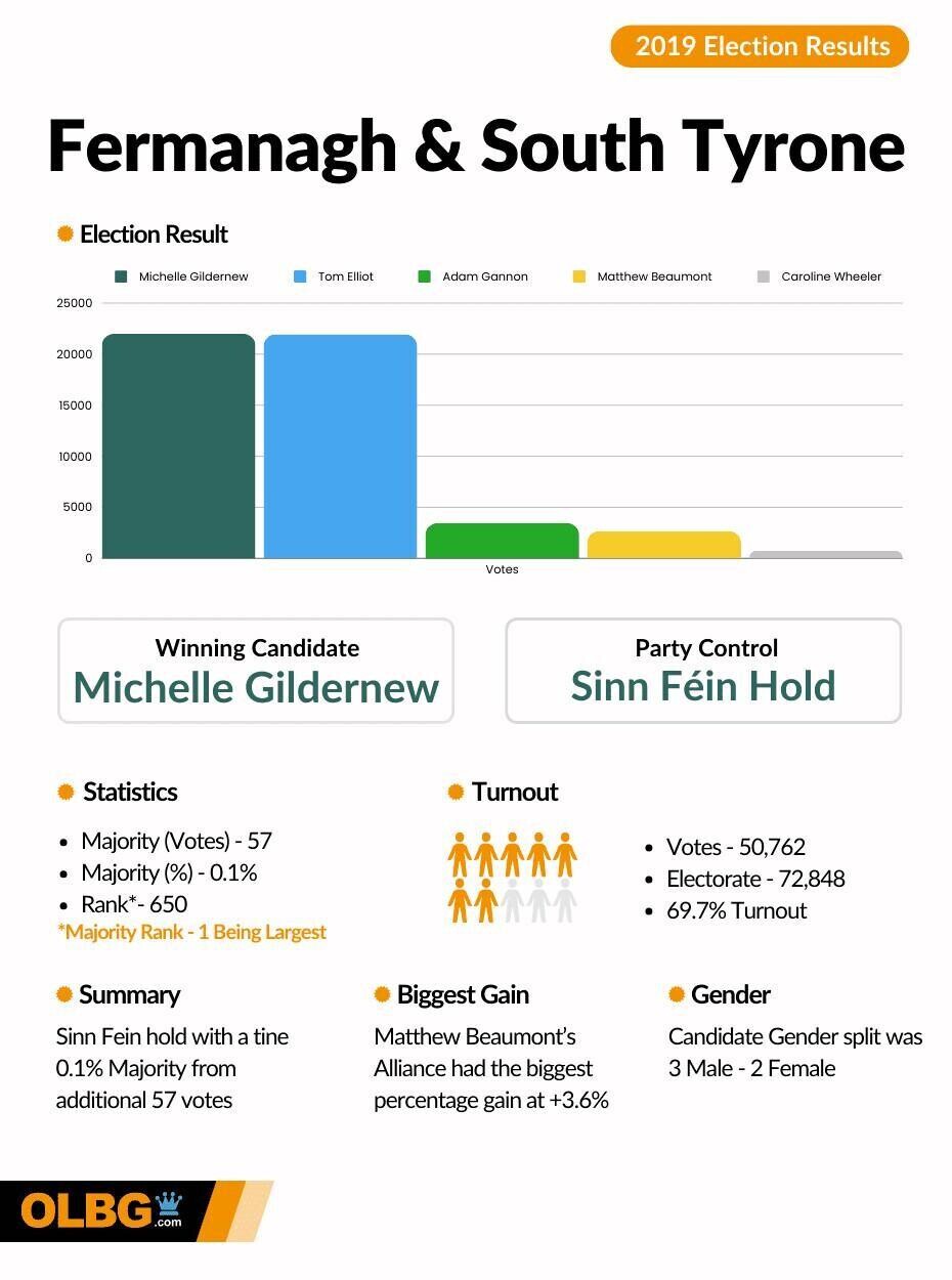 - Michelle Gildernew won the Fermanagh and South Tyrone seat by just 57 seats - the smallest majority of the 2019 election.