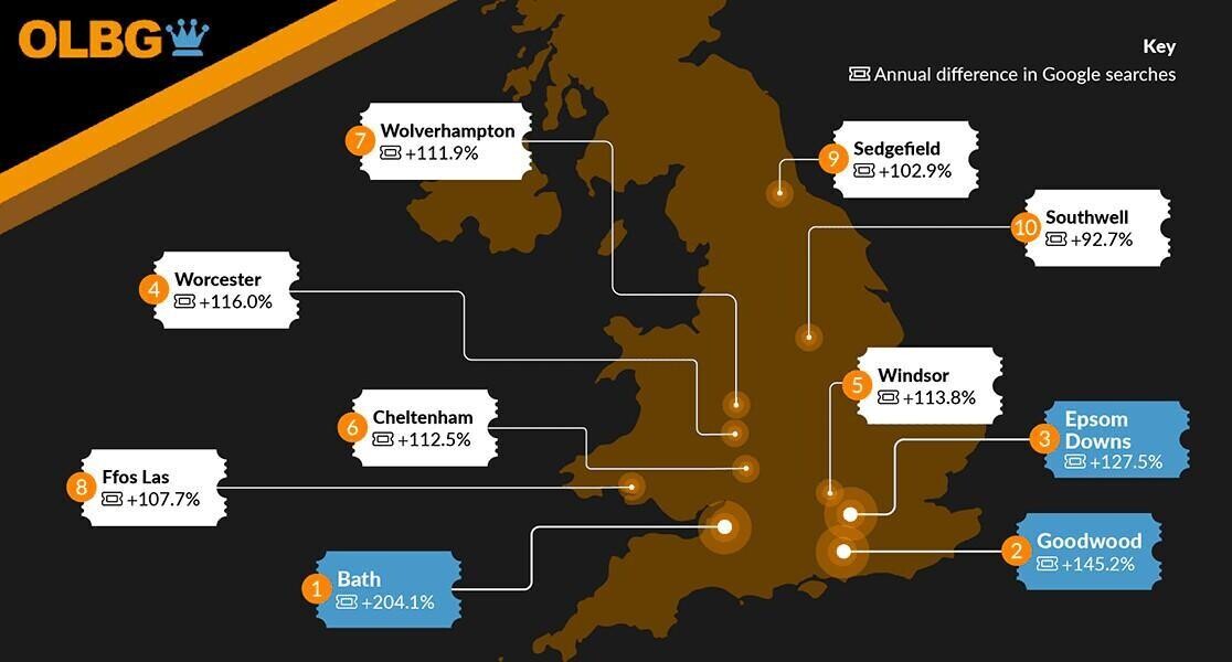 Another Scottish racecourse completes the top three, as Kelso has also seen a rise of just over 2,000% in total Google searches. Located in southern Scotland, just over the border from England, it is easy for fans from both nations to attend.
