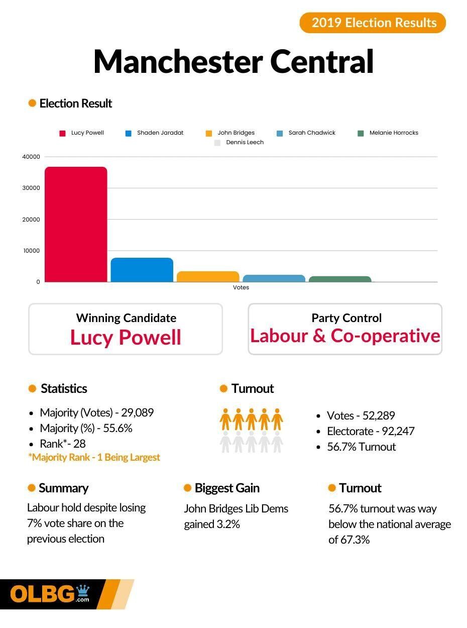 With a votes majority of 29,089 from the 52,289 cast, the majority in percentage terms was 55.6%, making Manchester Central the 28th-safest seat in the 2019 election.