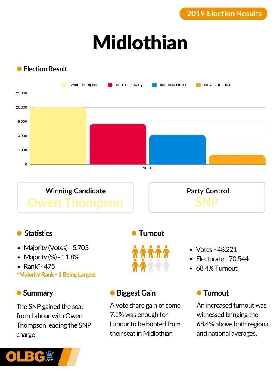 With a votes majority of 5,705 from the 70,544 cast, the majority in percentage terms was 11.8%, making Midlothian the 475th safest seat in the 2019 General Election.