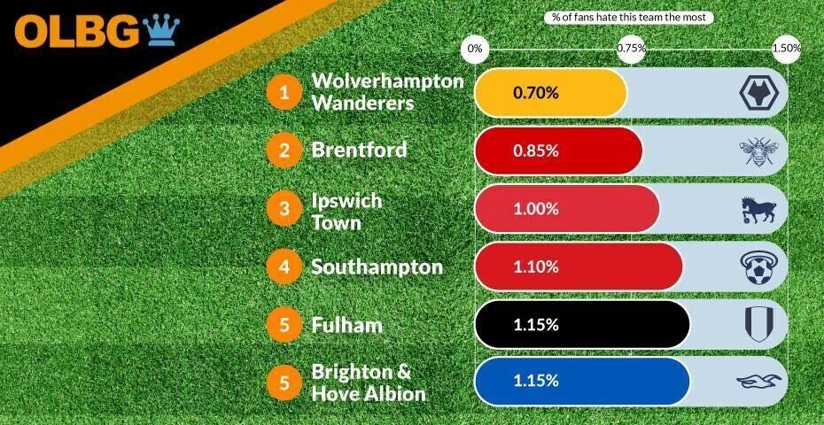 Wolves seemed to attract very little hate across the UK, receiving no votes from 10 out of the 15 cities surveyed. Despite such a low percentage of fans hating Wolves more than any other club, they did receive a lot of hate from Birmingham, where 4.6% of people said they despise their local rivals the most.