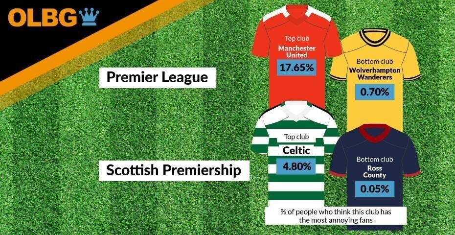 The crown for the most annoying fans in Scotland went to Celtic, with 4.8% of people being irritated by this fan base. Rangers were the second most annoying with 3.4%, and the least annoying fans in Scotland were Ross County’s, with just 0.05% of the votes.
