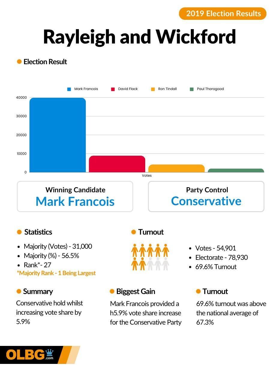 - In doing so, it meant that Rayleigh and Wickford was the party's seventh-safest seat in the 2019 General Election