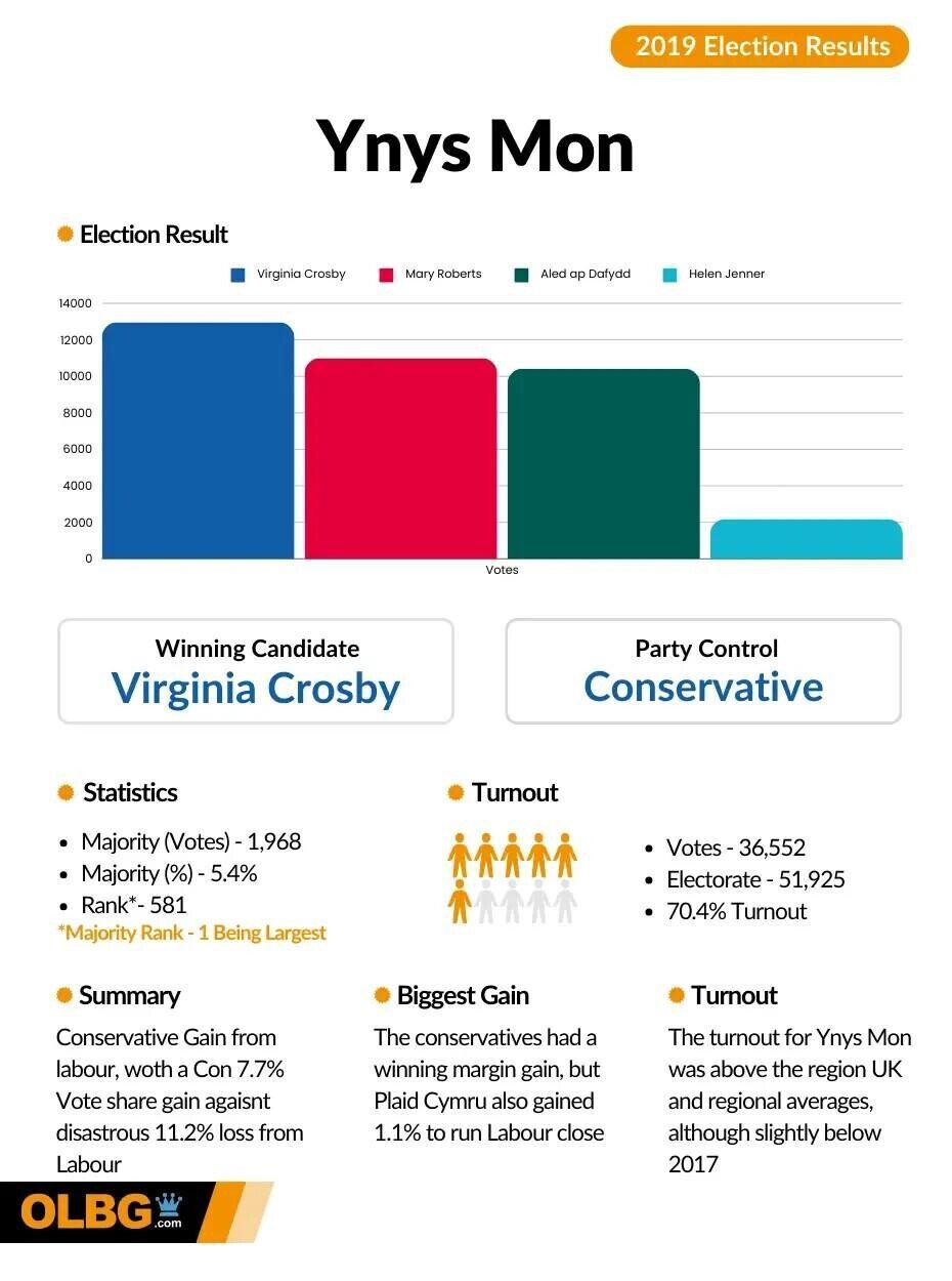 With a votes majority of 1,968 from the 36,552 cast, the majority in percentage terms was 5.4%, making Ynys Mon the 581st safest seat in the 2019 General Election.