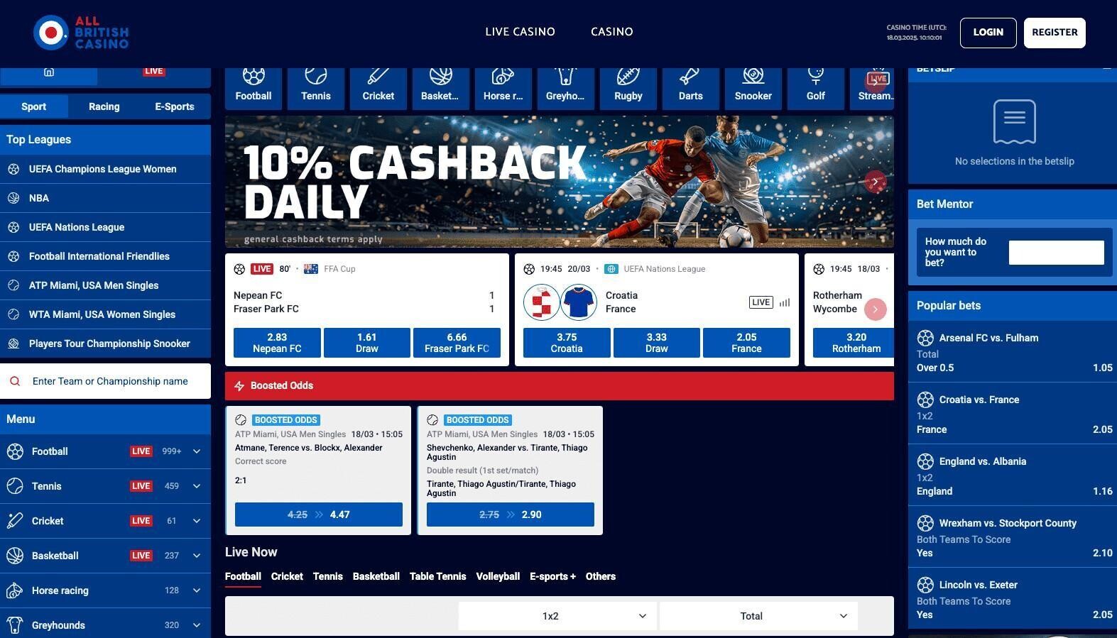 The best cash back offer across UK betting sites is from All British Casino. Punters get 10% back of ALL of their losses, on a daily basis. There are no stipulations regarding who's eligible, a maximum amount that you can get back, or overly-long time periods that you have to wait for to get money back. The offer is this: Punters get 10% cash back on 100% of their losses on a daily basis. So, at the end of every day, if you've lost any amount, you'll get cash back refunded into your account.