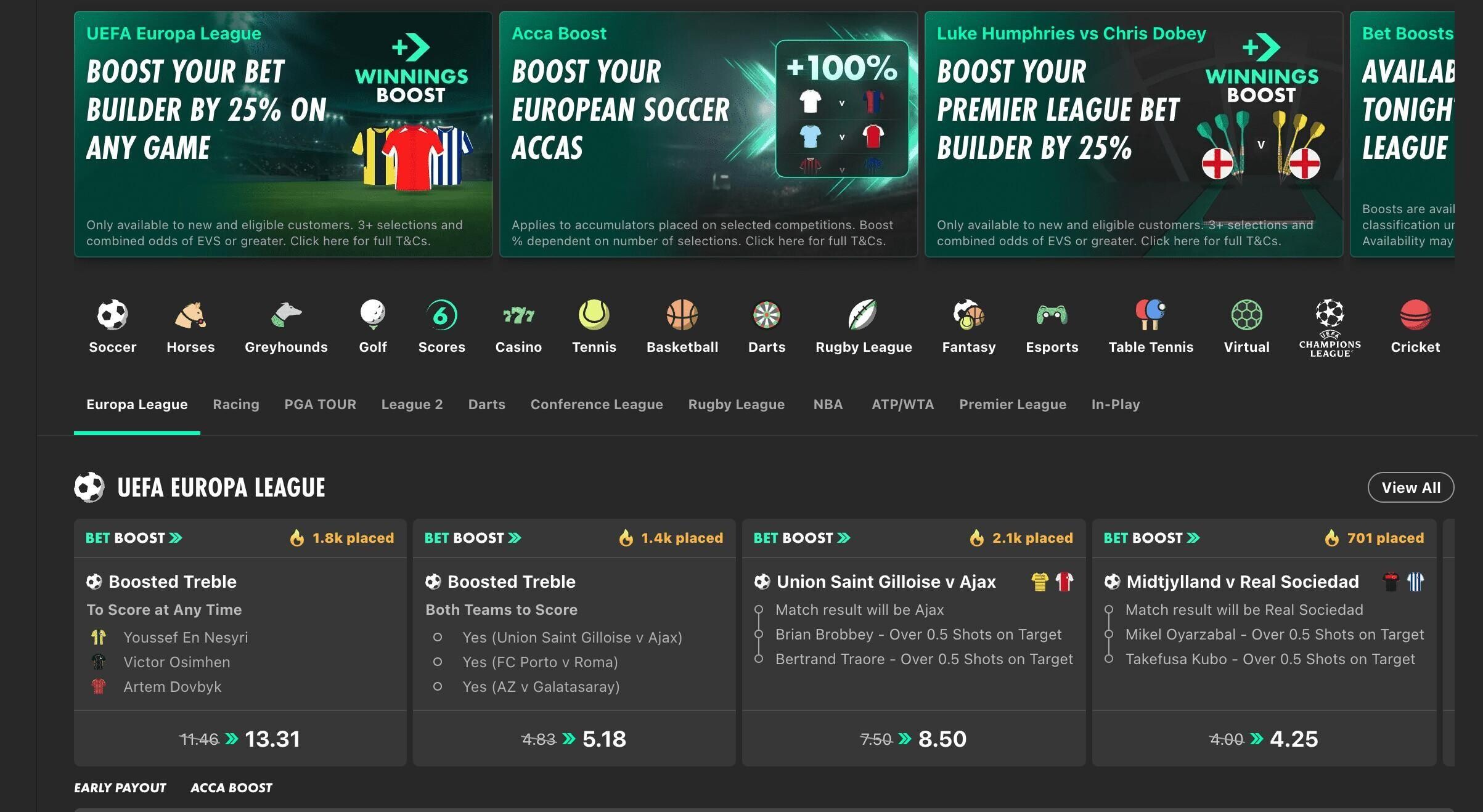 bet365 offer their Bet Boosts across multiple sports, in multiple markets, every day. Punters can see which markets have been boosted along the top of the sport's section, along with how much money has been staked.