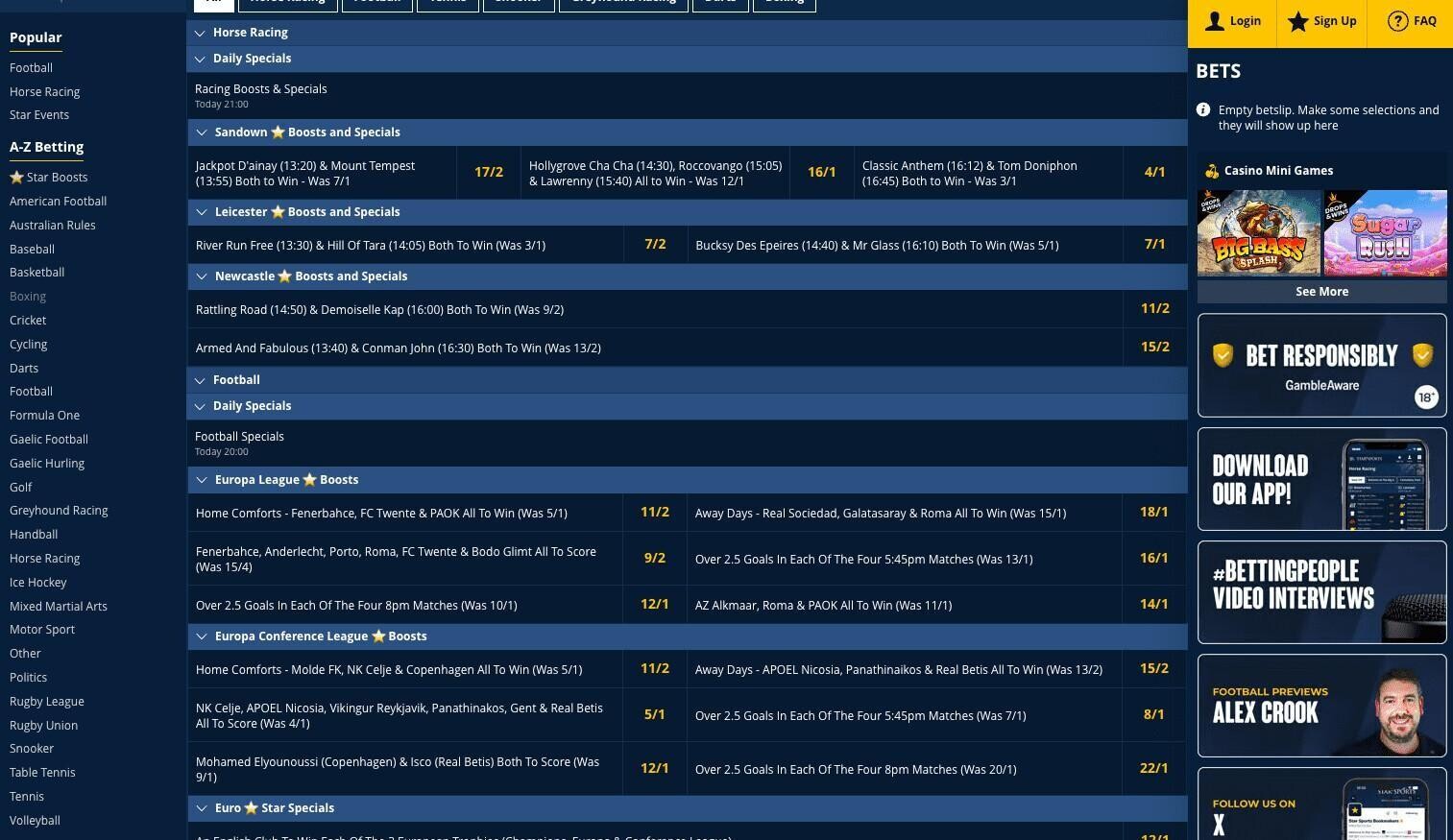 Star Sports offer boosts and special every day, with the image below typical of what's on offer on a midweek day. There are price boosts on horse racing, football, tennis, snooker, darts, boxing, greyhound racing and more. At the weekend this ramps up significantly and it's worth keeping tabs on what's on offer.