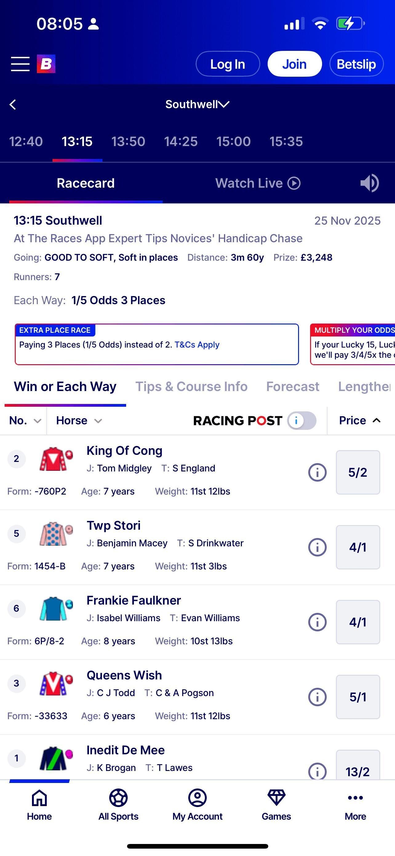 Coral is another old school, historic brand that still does the big sports well, and that definitely include horse racing. When you assess Coral's racing output it's not that it does any single thing spectacularly well, it's that its super solid at all aspects of its service. You get BOG at any time of the day, alongside good odds to begin with, the number of promotions is better than most – and that includes a really good Lucky15 bonus – and you can live stream all UK and Irish races through their site or app.