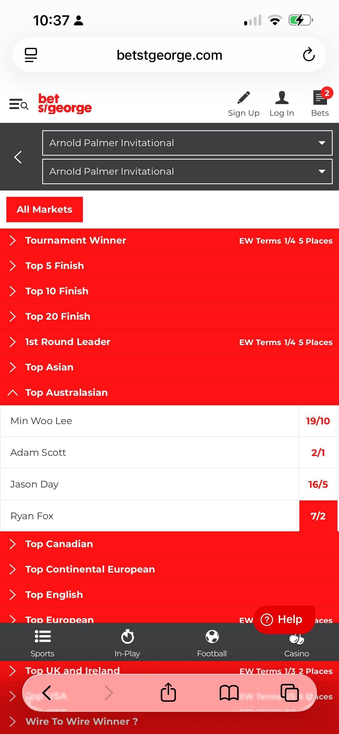 By James Banting - Bet St George’s golf offering is good. There are futures markets on all the majors (including the Ryder Cup and Solheim Cup), and there is a selection, around six or seven, of upcoming tournaments of varying importance. Yes, you’ll find a bit more at some other bookies – and it’s worth checking our best golf betting sites to see how Bet St George compares – but generally this is fine. Head into any specific tournament and you’ll find actually quite a nice number of markets to bet on, including Top 10 and Top 20 Finish, 1st Round Leader, and markets on each 2 Ball.
