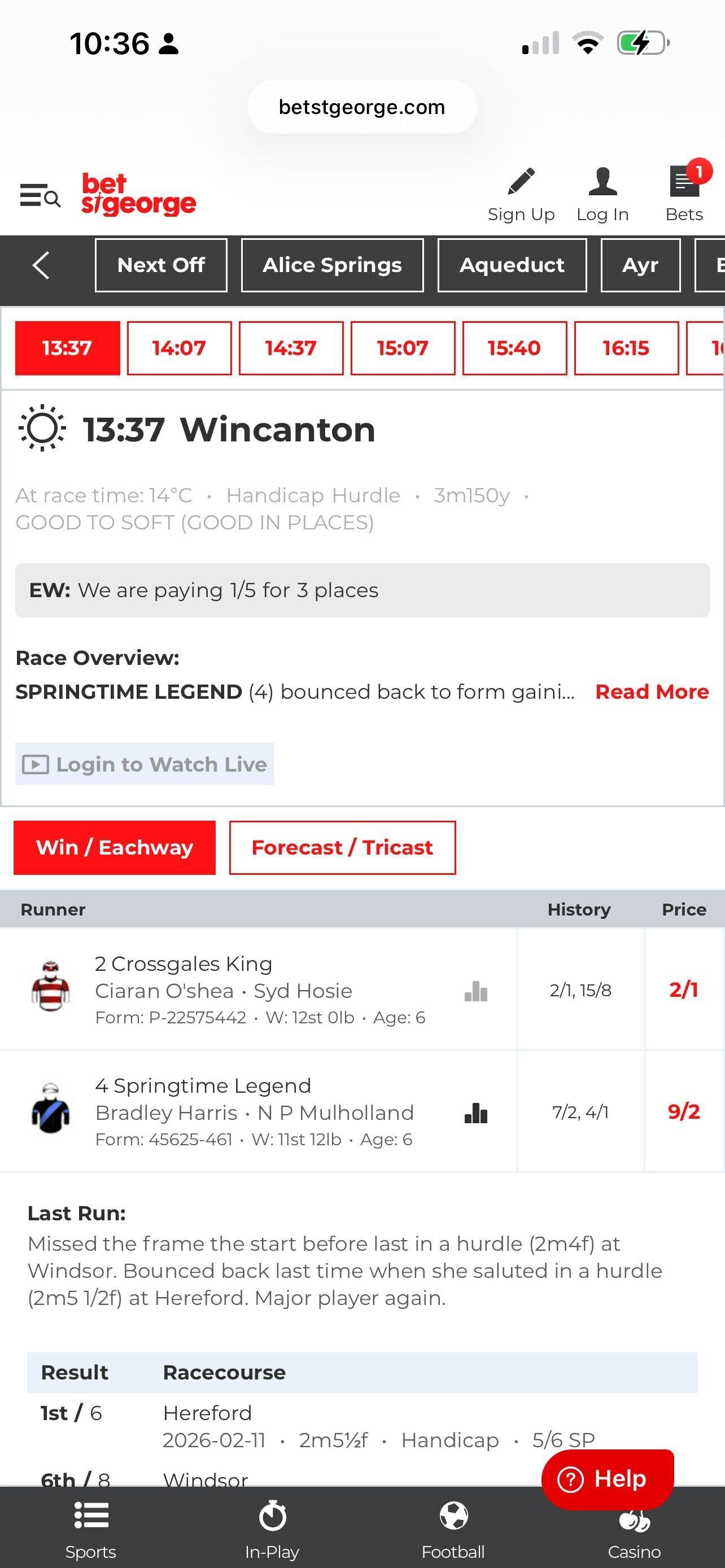 This is also probably one of the strongest aspects of Bet St George’ product, and that comes as no surprise given its British branding. All UK and Irish meets are covered, while punters can also bet on international meets, including the US, Australia, Brazil, South Africa and others. Flicking the race order between odds and racecard is also a nice little touch. In terms of promotions. The odds look decent enough, there’s some form listed for each race, but it would be good if there were more markets beyond winner and forecast/tricast.
