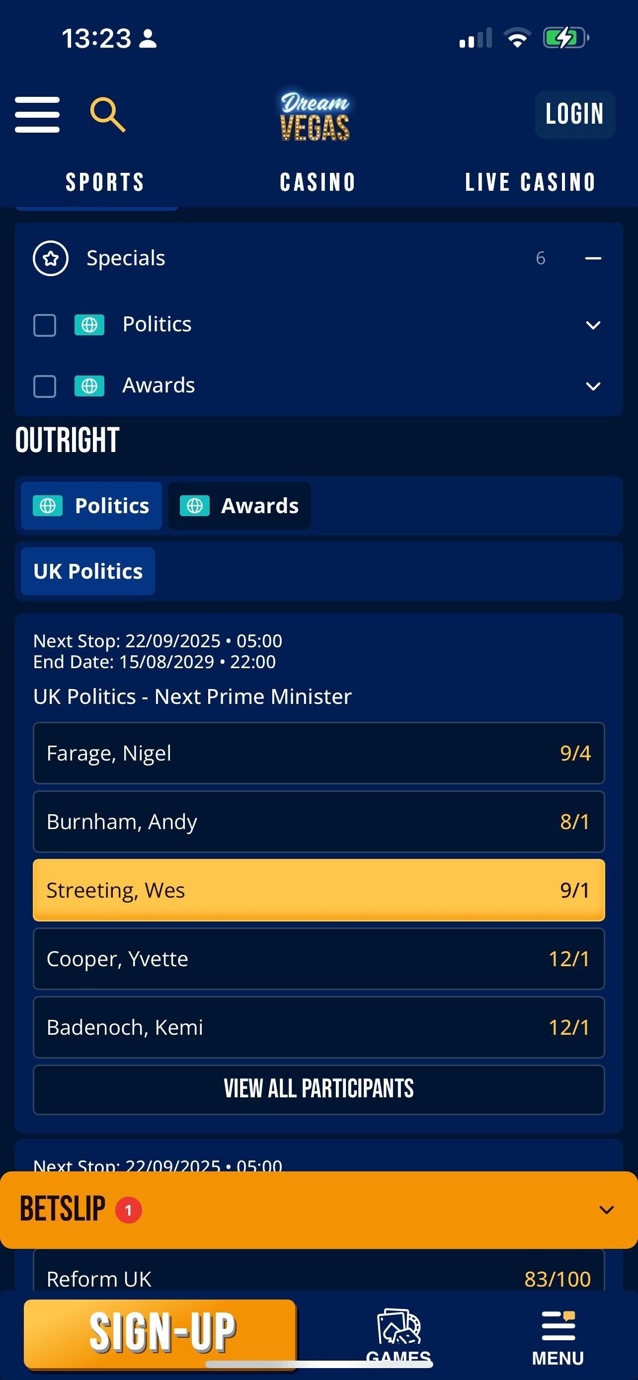 We rank every bookie, at every sport, and Dream Vegas is just a bit off our best football betting sites in the UK, but it’s still very good. The menu panel is telling me that there’s over 1000 different markets that I can bet on at this moment in time, evidence that it covers the sport in terms of event coverage as well as most other bookies. Beyond that, you can’t argue with the market depth per event, which is also very impressive. There’s no live streaming, however, and the in-play betting isn’t as good as some others, which is why it doesn’t quite make our top 10.