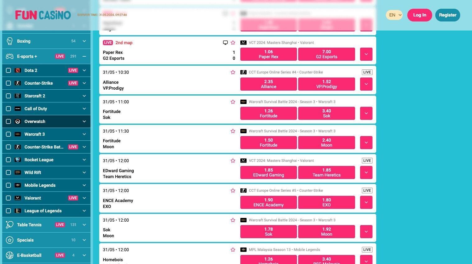 This is extremely easy to find, as the pink “LIVE” icon pops against the teal background. Not only can you head straight to the live betting part of the site, but all sports that currently have live markets feature the same red icon in the menu bar. I can immediately see that there’s plenty of live markets, and there can’t be many other bookies offering in-play odds on beach volleyball and E-ice hockey markets like Fun Sports does. See if they make it into our best bookmakers for in-play betting.