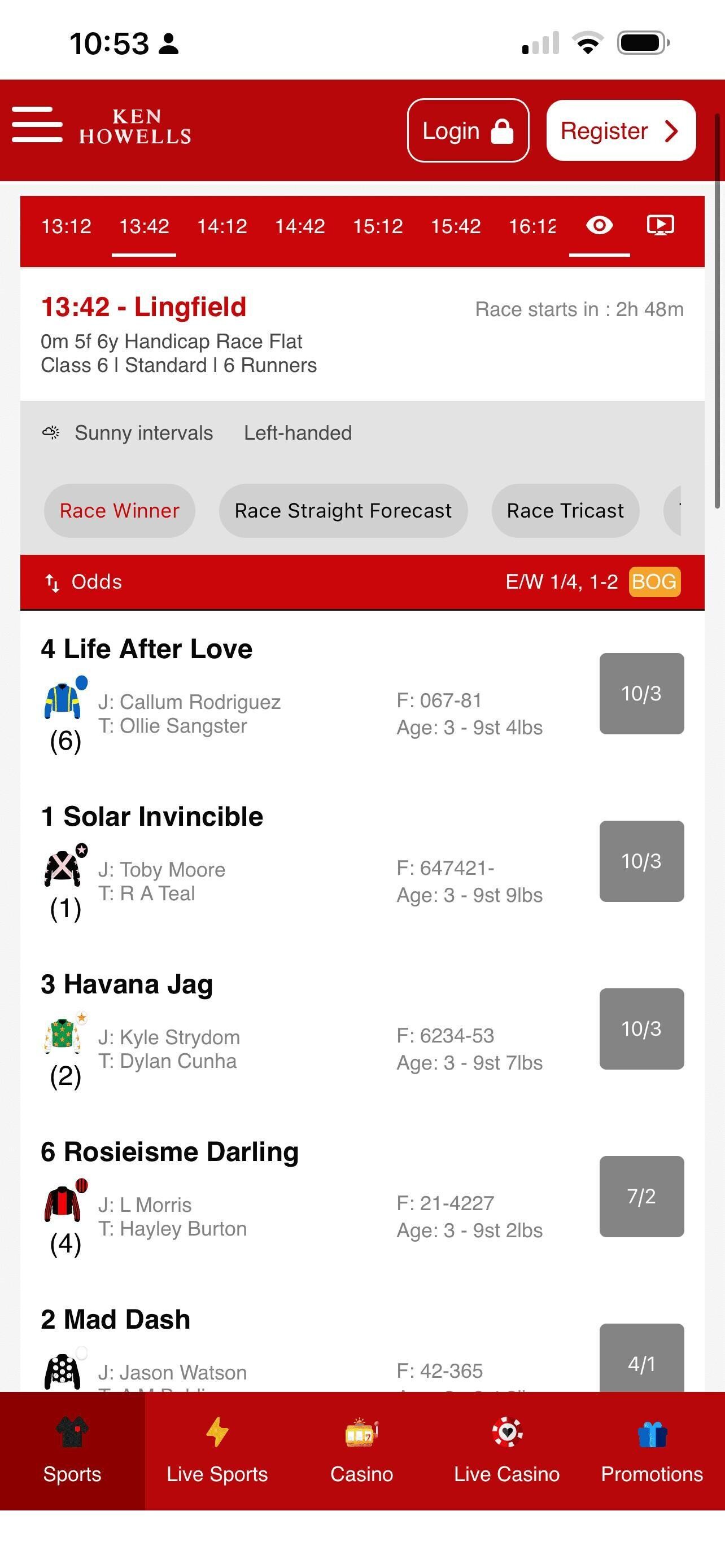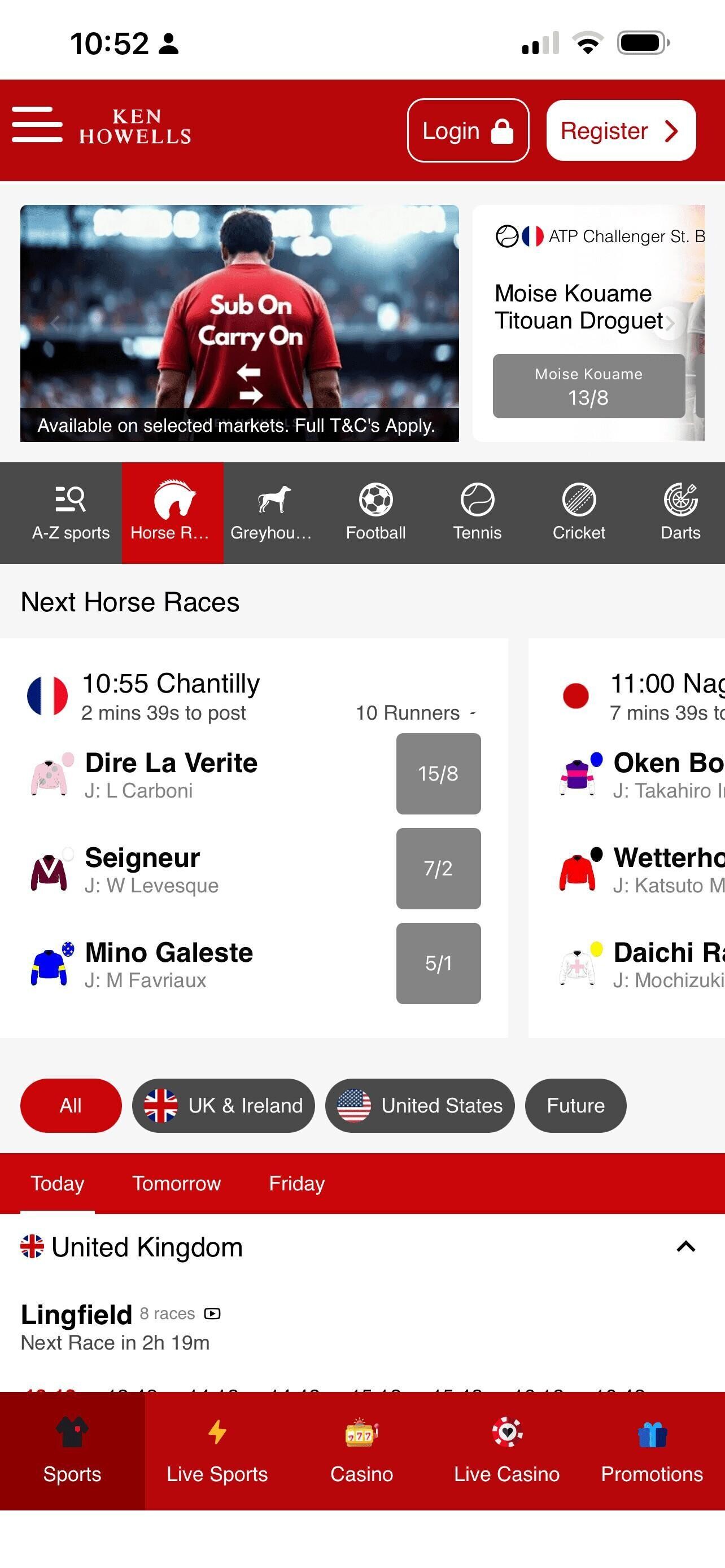 This is probably the strongest aspect of Ken Howells’ product, and that comes as no surprise given its experience in betting. All UK and Irish meets are covered, with Best Odds Guaranteed offered from 10am. Punters can also bet on international meets, including the US, Australia, Brazil, South Africa and others. Flicking the race order between odds and racecard is also a nice little touch. In terms of promotions, Ken Howells offers Double Result, paying First Past The Post and Official Result
