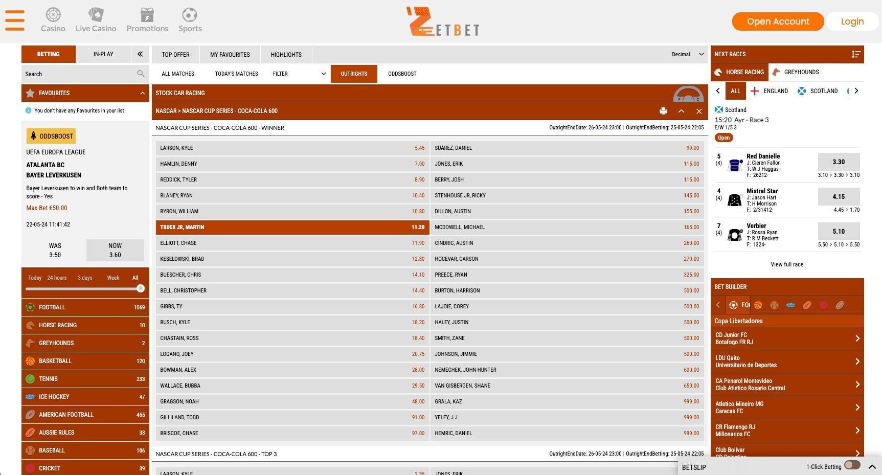 Comparing ZetBet’s odds to that of other bookies, as well as checking some comparison sites, ZetBet – like other Aspire Global brands – offers very solid across the board . We checked football, tennis and cricket for in-play odds, plus horse racing, greyhounds and darts for pre-match and ante post odds. What’s worth highlighting is that ZetBet offers odds on some very niche sports (pesapallo and stock car racing, for example), so will be one of the few places you can find odds on such sports at all.