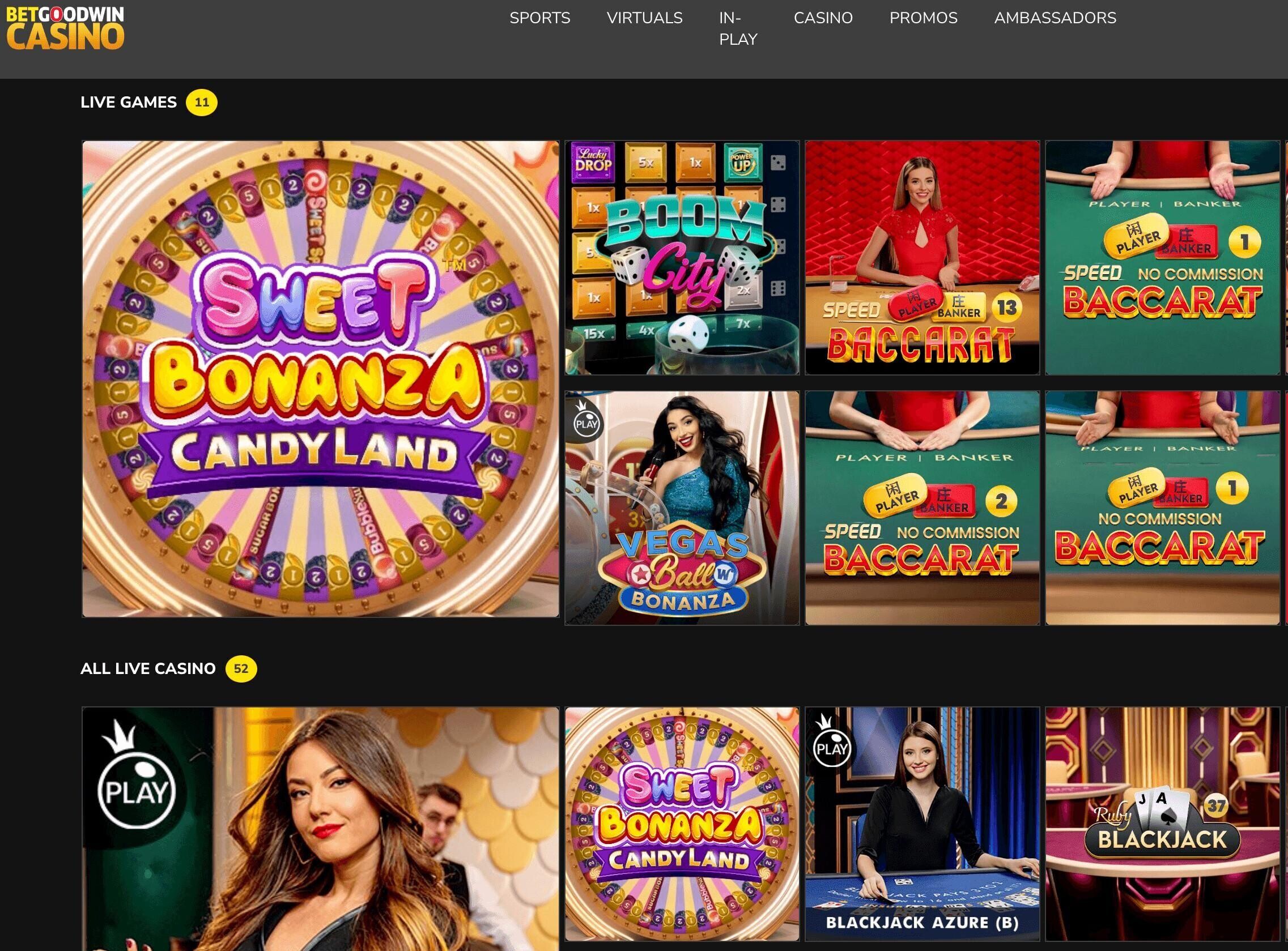 There are 11 different live studio games at Betgoodwin Casino, with roughly half being baccarat games. Players can enjoy Sweet Bonanza Candyland, Boom City, Vegas Ball Bonanza and Dragon Tiger. All of the live studio games are from Pragmatic.