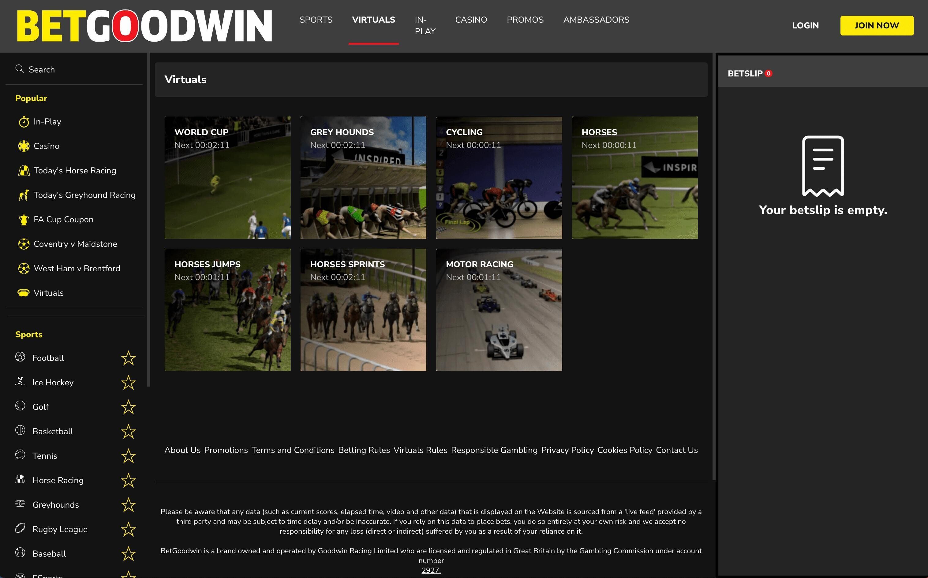 Betgoodwin's virtual sports betting is pretty good, overall. There are seven different games in total, with horse racing, football, motor sports, greyhounds and cycling all included. This means that punters can bet on virtual sports at pretty much any time of day, with very regular starts to all the titles. It's worth checking out the best Virtual sports betting sites guide.