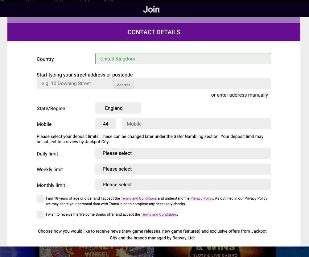 Input contact details – address, phone number etc. – as well as setting deposit limits.