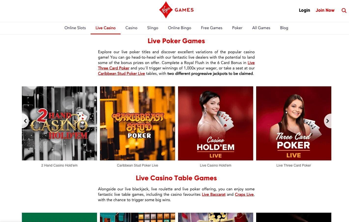 Virgin Games’ blackjack section is excellent, with a decent balance between live and standard versions. There are over 25 different blackjack games listed, with a number of seats available at a wide variety of tables, including Lightning Blackjack, where you could trigger multipliers worth up to 25x to boost your winnings, or you can play Madison Avenue Blackjack for the chance to win payouts of up to 100:1 on the 21+3 side bet.