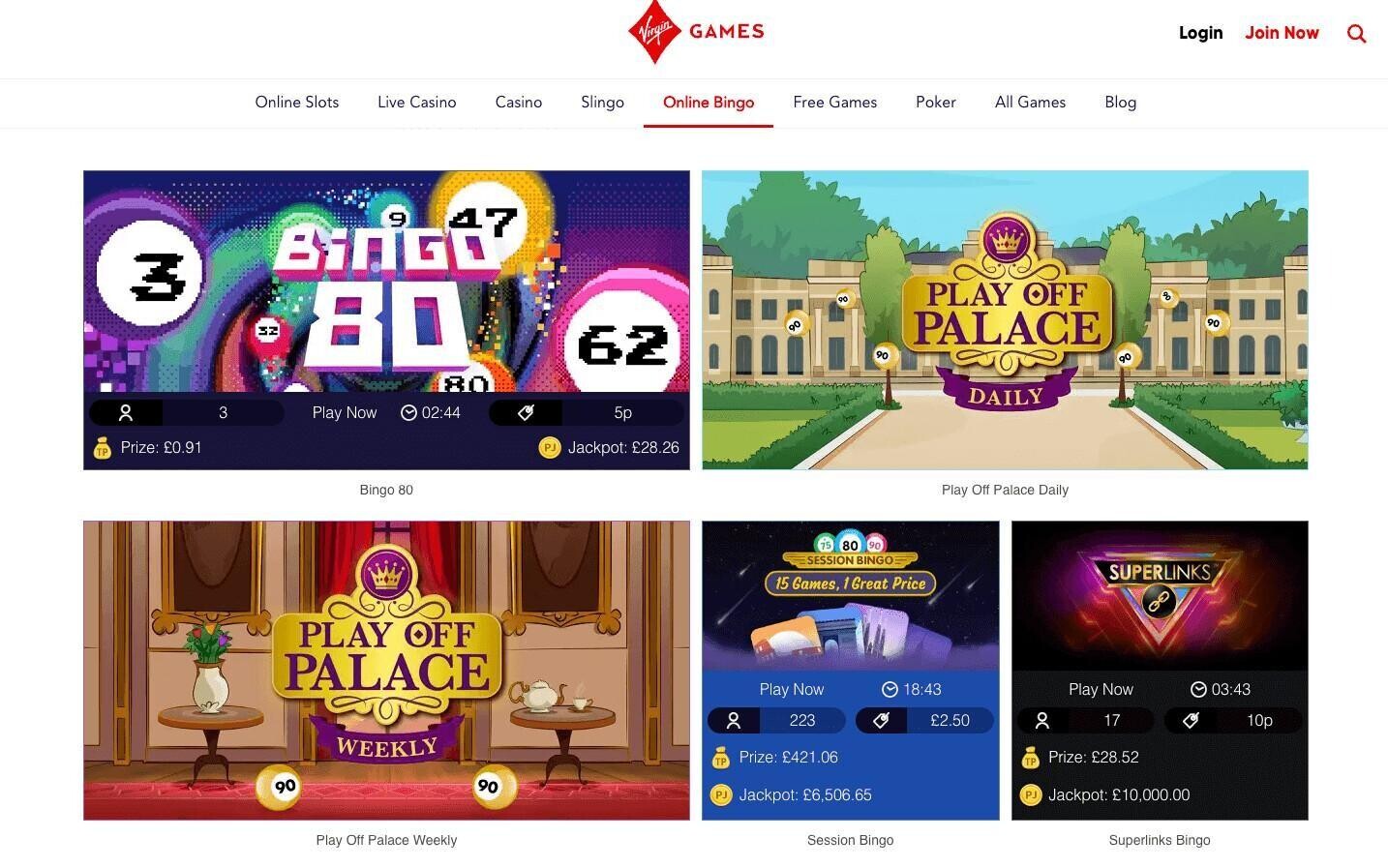 You can play bingo at Virgin Games for the chance to win huge prizes, with £20,000 in jackpot payouts can be won every day via their Superlinks Bingo progressive jackpots, and there is a jackpot available in every one of their bingo rooms. Expect to find Bingo 80, Play Off Palace Daily, Session Bingo and Superlinks Bingo, among other really impressive titles.