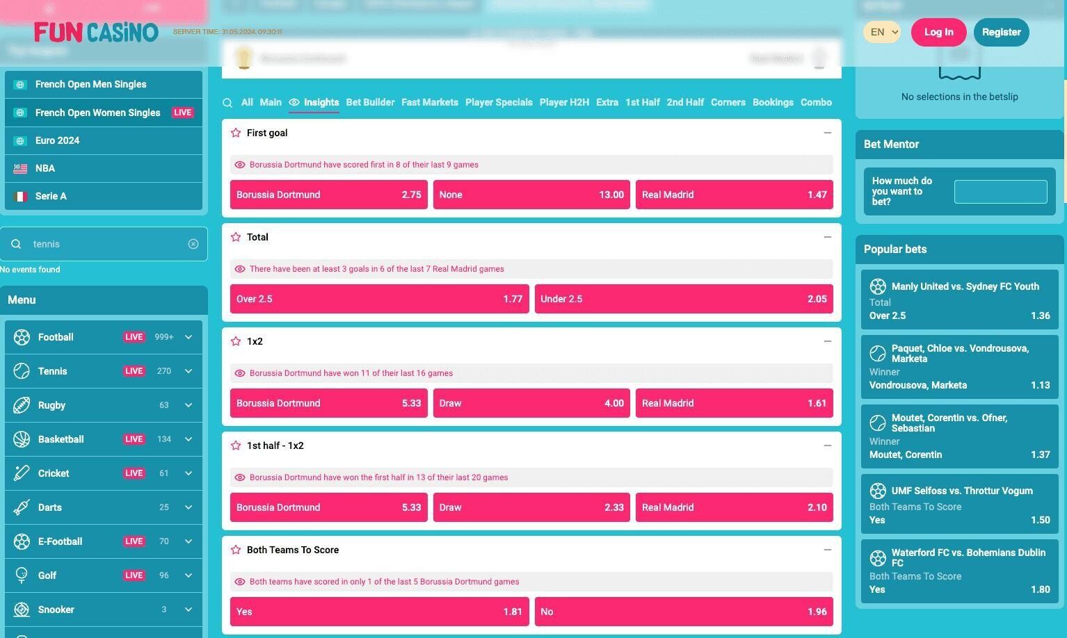 Fun Sports comes quite close to making our best football betting sites. The menu panel is telling me that there’s over a thousand different games that I can bet on at this moment in time, and that’s as good as anyone in the industry. There’s a great option to bet on whether there will be a card, corner or goal in the next five minutes of a match and another nice touch is their Insights feature. This is a particular stat based on recent form or data, with a corresponding market below eg “Both teams have scored in 11 of the last 12 Liverpool home games” and the BTTS market below.