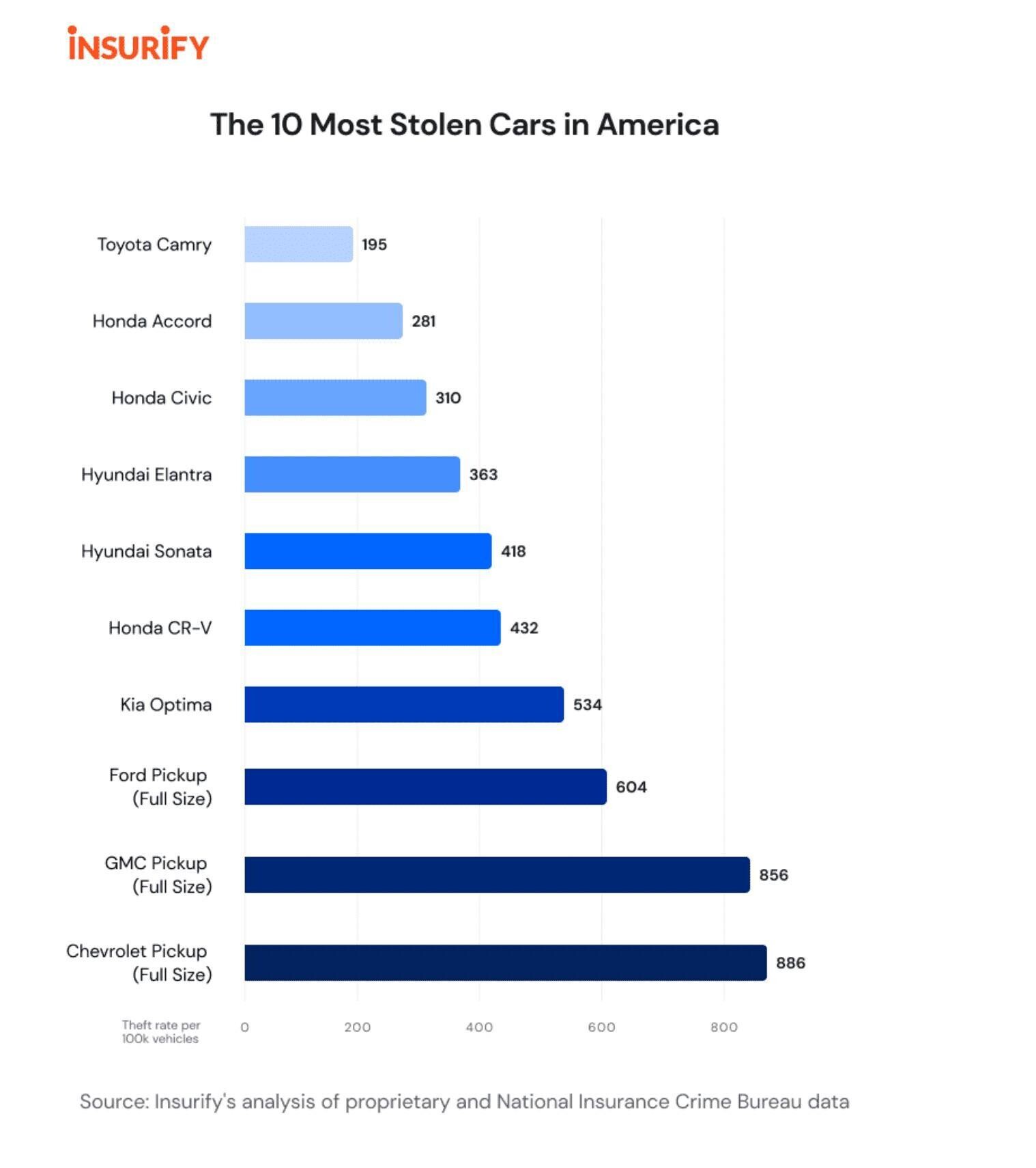 Pickup trucks in the USA make up a large portion of the total cars that are stolen with that data shown from Insurify showing just how many are taken illegally.