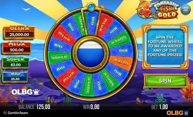 Like all of the Fish 4 slot games, the setting is a tranquil blue sea with most of the action taking place below the waves where you spot tropical fish swimming around the screen. The reggae music and upbeat sound effects complete the picture of being somewhere warm and sunny. This game has the addition of the wheel of fortune which is constantly spinning in the background.