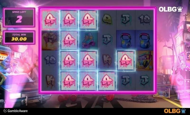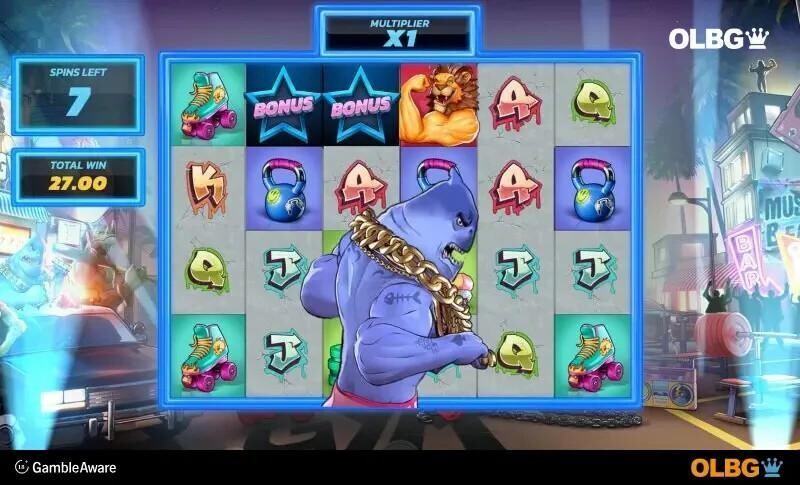 Talking about the Free Spins bonus round, the vibe changes as it turns to the night. The animals are armed with weapons and the music speeds up. The action takes place under neon lights in the outdoor gym and there are people partying in the background.