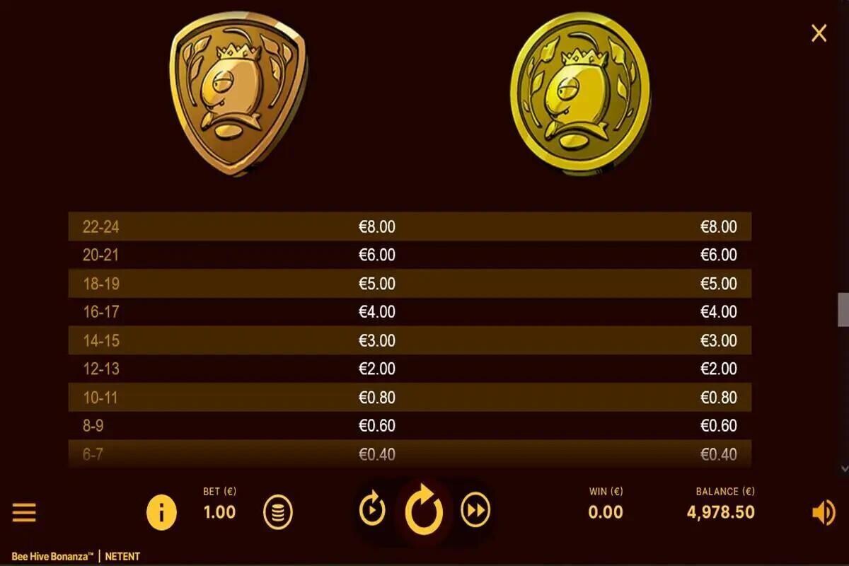 The abovementioned story is reflected on the payout table, where you will notice Coins and Shields representing various bee characters acting like standard symbols. The platinum, triangle-shaped plate with a king bee is the most valuable icon, providing prizes worth up to 8 times the stake.