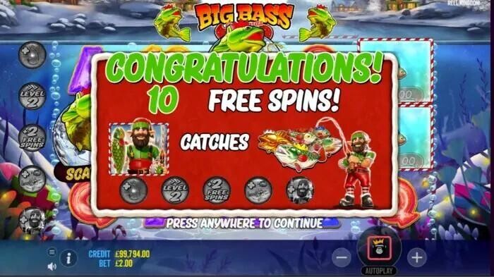 Deck the halls and all that - Christmas is just around the corner, so the Christmas 2023 slot games are ramping up. There is so much scope with a Christmas theme, take your pick from tinsel, trees, candy canes, Santa and stockings - the list is endless. In the background of this game, you'll see the usual Big Bass underwater scene complete with bubbles and weeds. This one randomly has candy canes, presents and fairy lights thrown in for a bit of seasonal good measure. At the top of the screen, the scene is quite different with an iced-over lake and snow-topped alpine houses. The bonus round has the same view with the addition of the progress bar at the top of the screen.