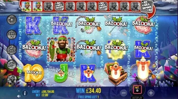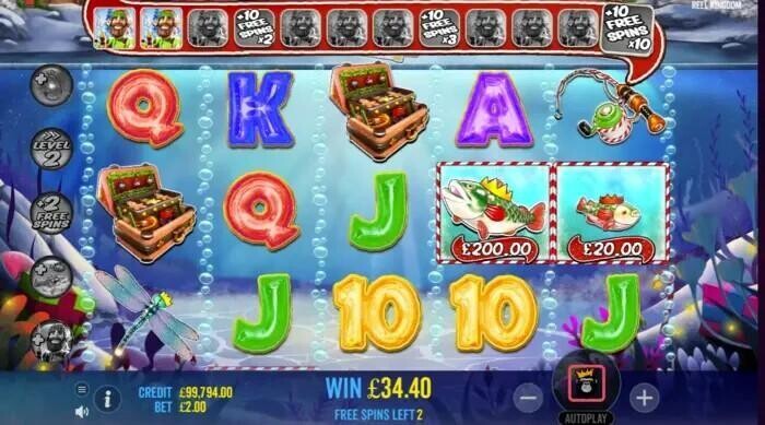 Just before the Free Spins round starts 0-5 modifiers that apply to the subsequent round are randomly selected. The 5 modifiers are - more Fish Symbols, more Fisherman Wilds, more Dynamites, Hooks and Bazookas. Or you can start from level 2 which gives you a head start. Lastly, you can receive 2 extra free spins – you start with 2 free spins plus you receive 2 extra free spins on every retrigger.