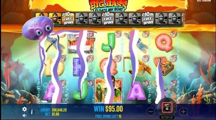 The graphics look typically Big-Bass-like, showing the Fisherman on yet another sea-faring adventure. This time, it is set against a glowing sunset plus the usual underwater scene of fish and seaweeds.