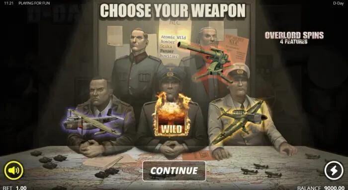 Free Spins There are 3 free spins round to enjoy for the D-Day slot game. First up are the Neptune Spins, which include 2 features. You enter the round by landing 3 Scatter symbols. Once the round is triggered, you will get a pick-and-reveal option, which will reveal 2 out of 5 features which are weapons. If a Scatter lands on reel 5 while triggering Neptune Spins, then the Atomic Wild feature will get activated, and you will get only 1 option to pick and reveal from the remaining 4 features. Each revealed feature will activate at least once during Neptune Spins.