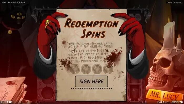 I liked the look of the reel area of the Devil's Crossroad - as mentioned already, it's divided into four cross sections and it mixes play up when a symbol lands next to the centre and morphs into a Wild. The Redemption Spins bonus round was fun once I understood the coin mechanic, glow-up progress meter and heart. Basically, you can be upgraded once you either collect 4 levels in the progress bar or land 3 Scatters in the centre position.