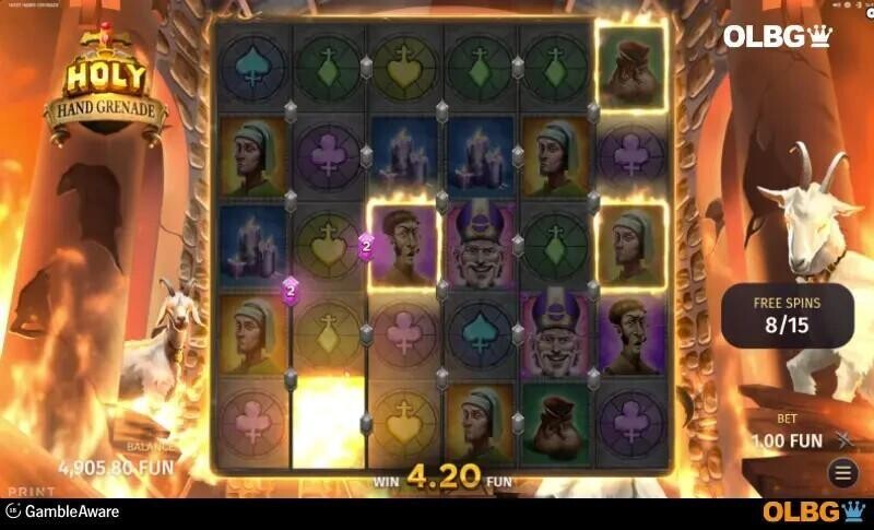 You will be awarded 2 extra spins for each holy hand grenade symbol that lands during free spins. And if a holy hand grenade lands inside a frame, it will trigger the Holy Hang Grenade symbols with a larger explosion.