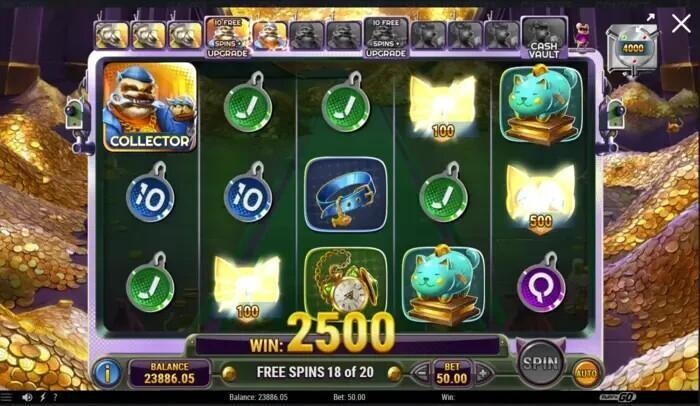 Within the character symbols on the reels, you’ll see a collection of treasures that have been stolen by Fat Cat. Starting with the highest value first, there’s a Fabergé golden egg, a turquoise and gold cat money box, a golden pocket watch, a fancy collar with a goldfish accessory and the Diamond Cash Symbols. After this, it’s the standard symbols of A, K, Q, J and 10 set in a colourful, posh animal tag setting. When you switch to the Free Spins bonus round the 3 dodgy-looking canines make more of an appearance on the reels. You see their mugs on The Trail where you fill up with Dog Collector Symbols. The Free Spins round takes place in a vault bursting to the brim with gold coins.